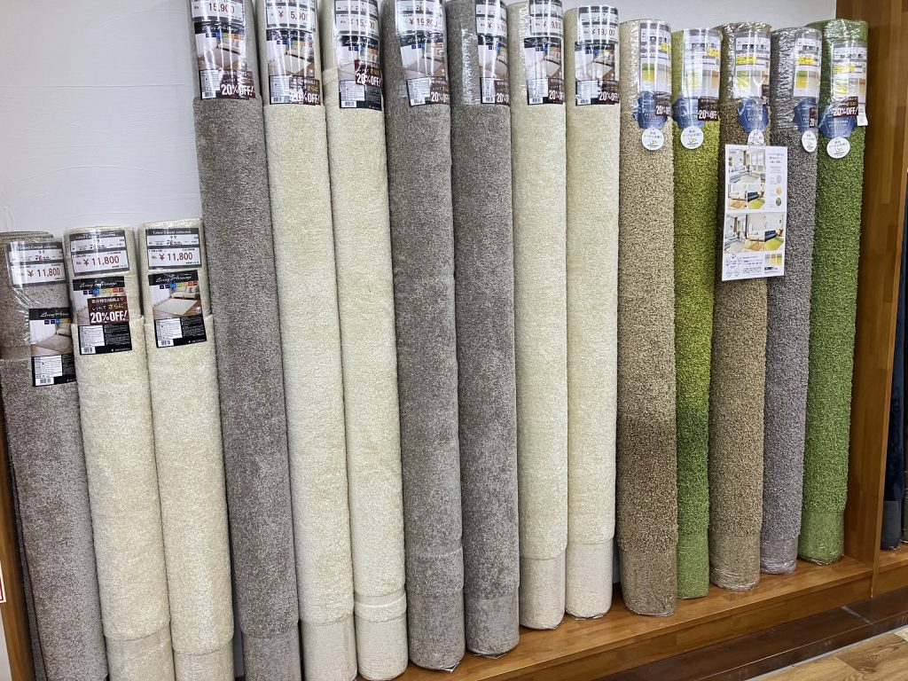 豊富なカーテンサンプルもありますが、カーペットも数多く展示/販売しています。