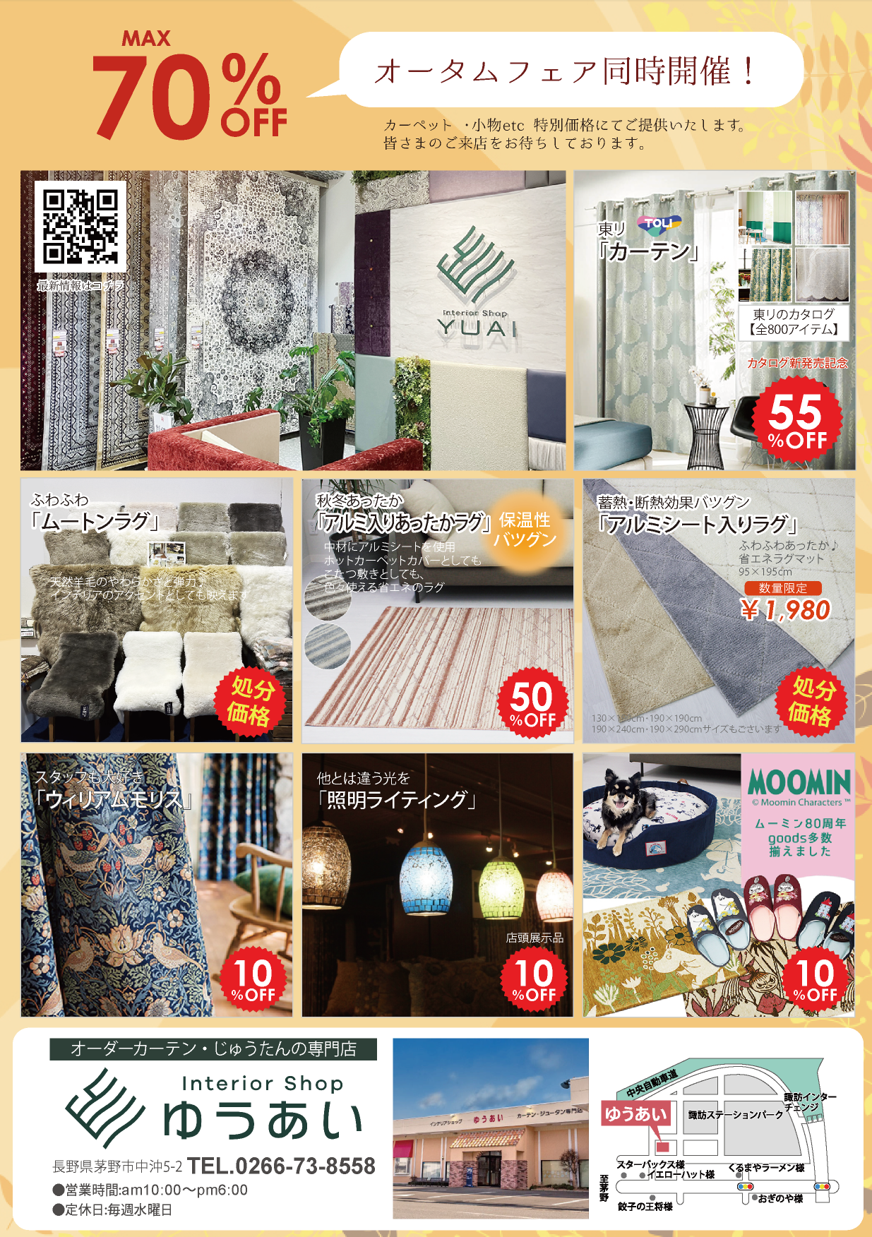 店内商品・カーテン・カーペット・小物などが特別価格になる「オータムフェア」も同時開催!