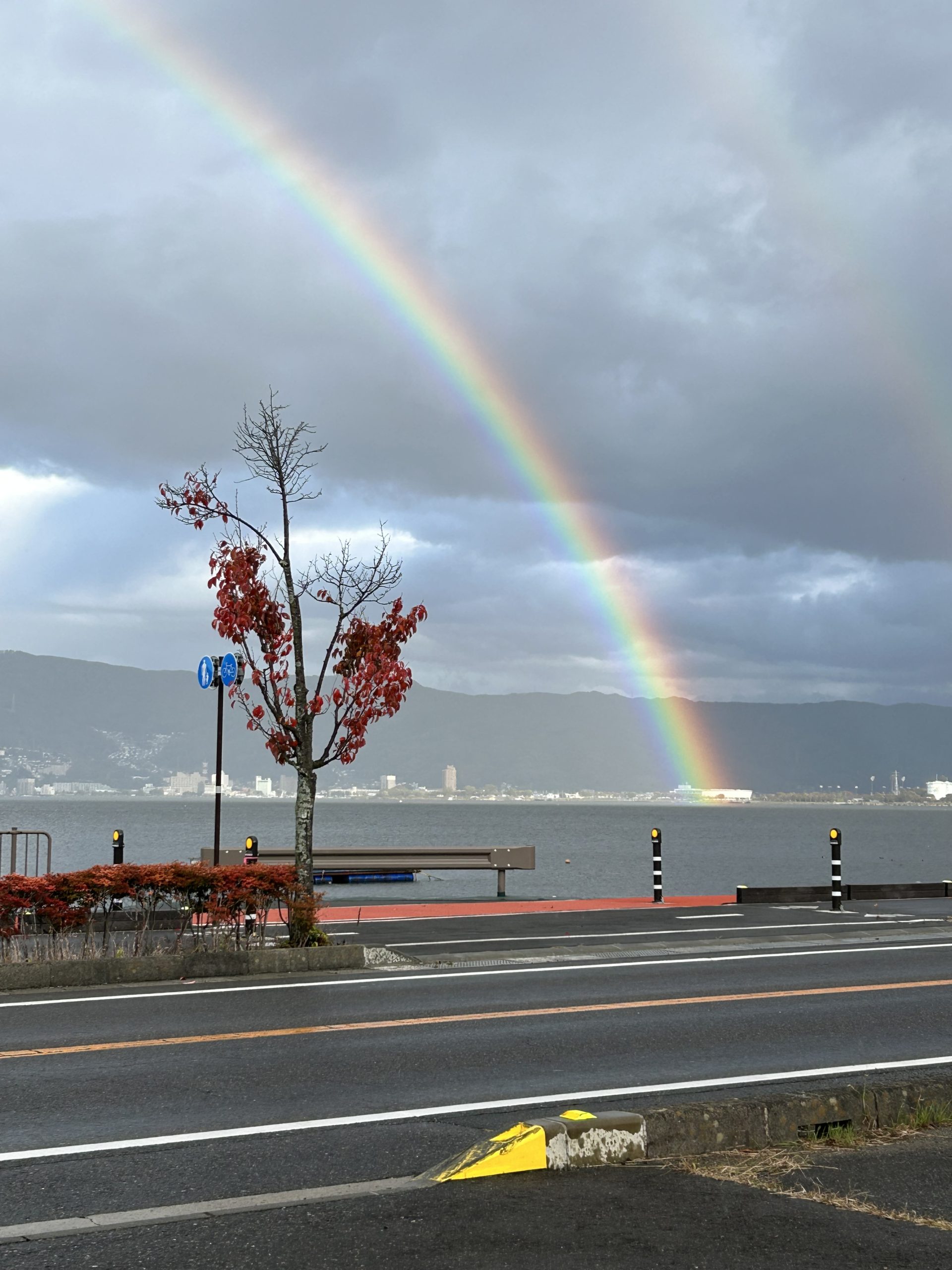 そんな諏訪湖をこの前もよそ見しながら走っていますと、絵に描いたような虹が出ていたのでびっくり。思わず写真を撮りました。