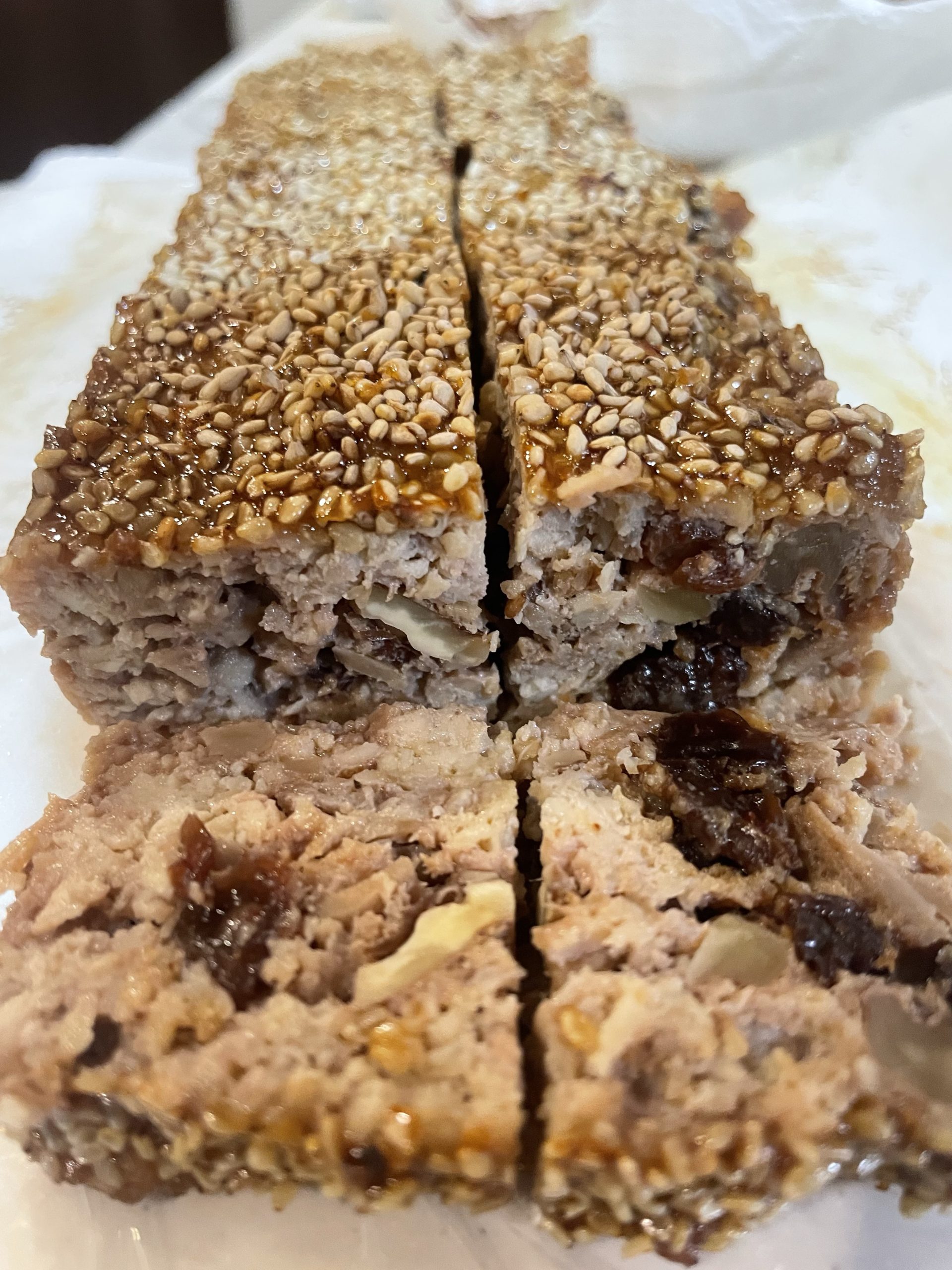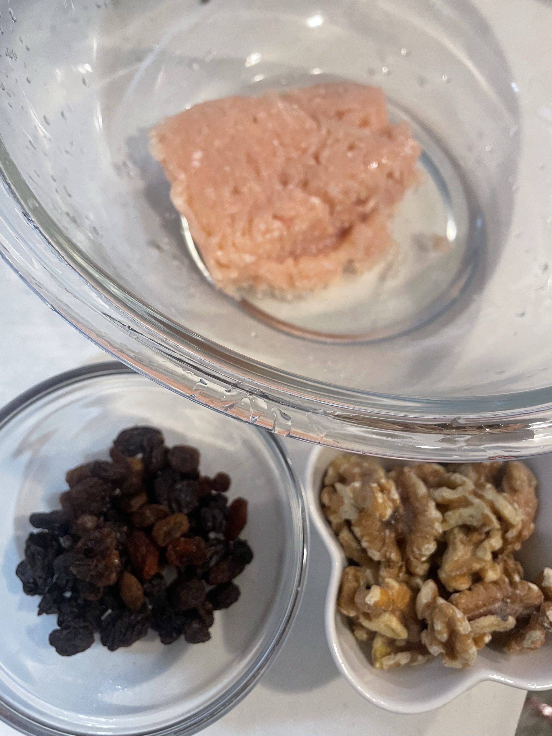 鶏ひき肉、レーズン、クルミ、ごま、卵