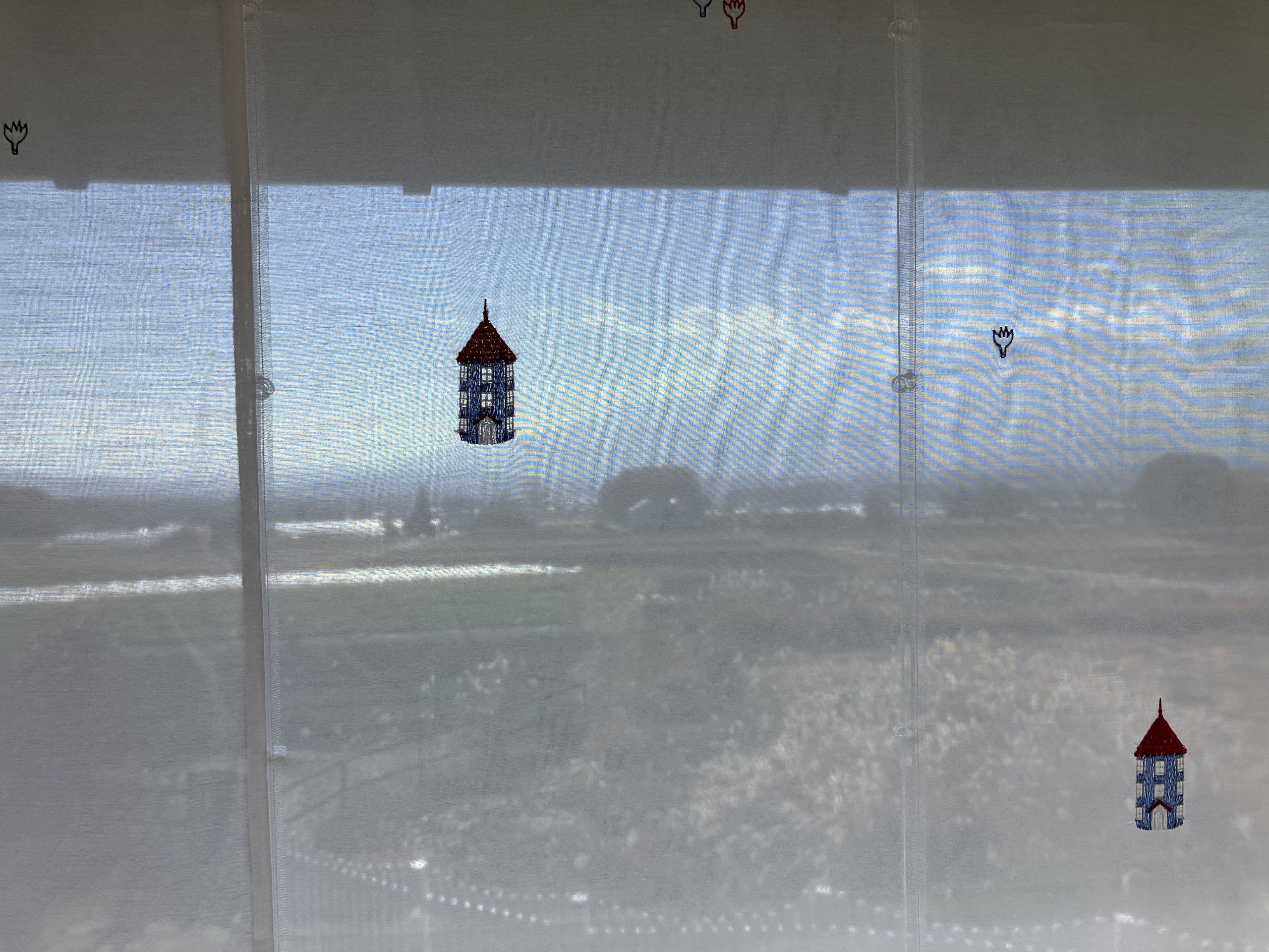 色鮮やかなムーミンハウスが刺繍された、ボイルレース。