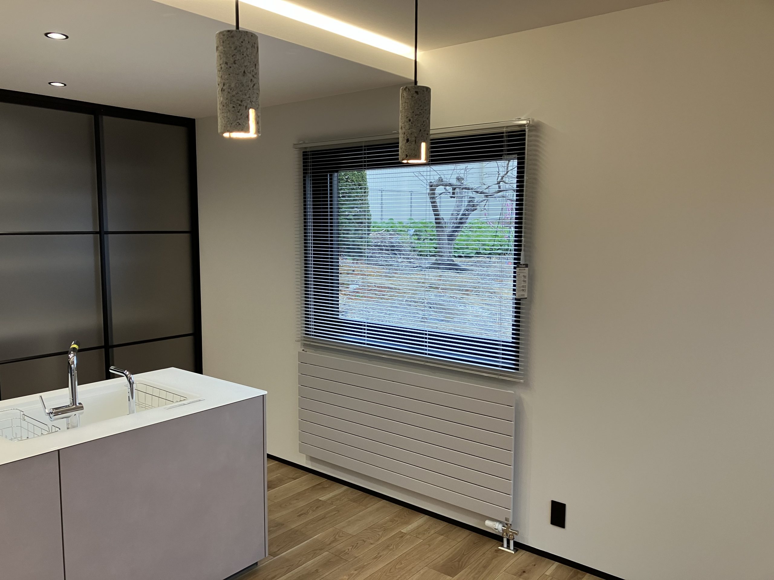 壁紙、パネルヒーター、キッチンとの色のバランスを素敵です