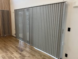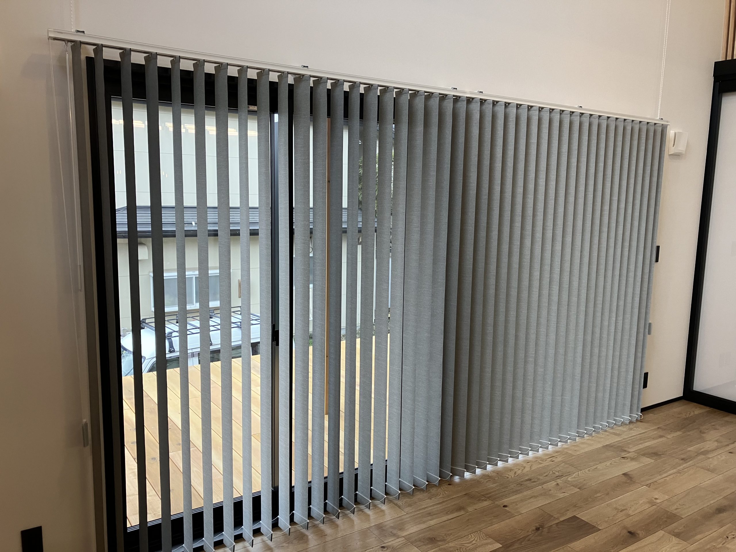 吹き抜け下のリビングスペースの掃き出し窓はタテ型ブラインドを施工しました